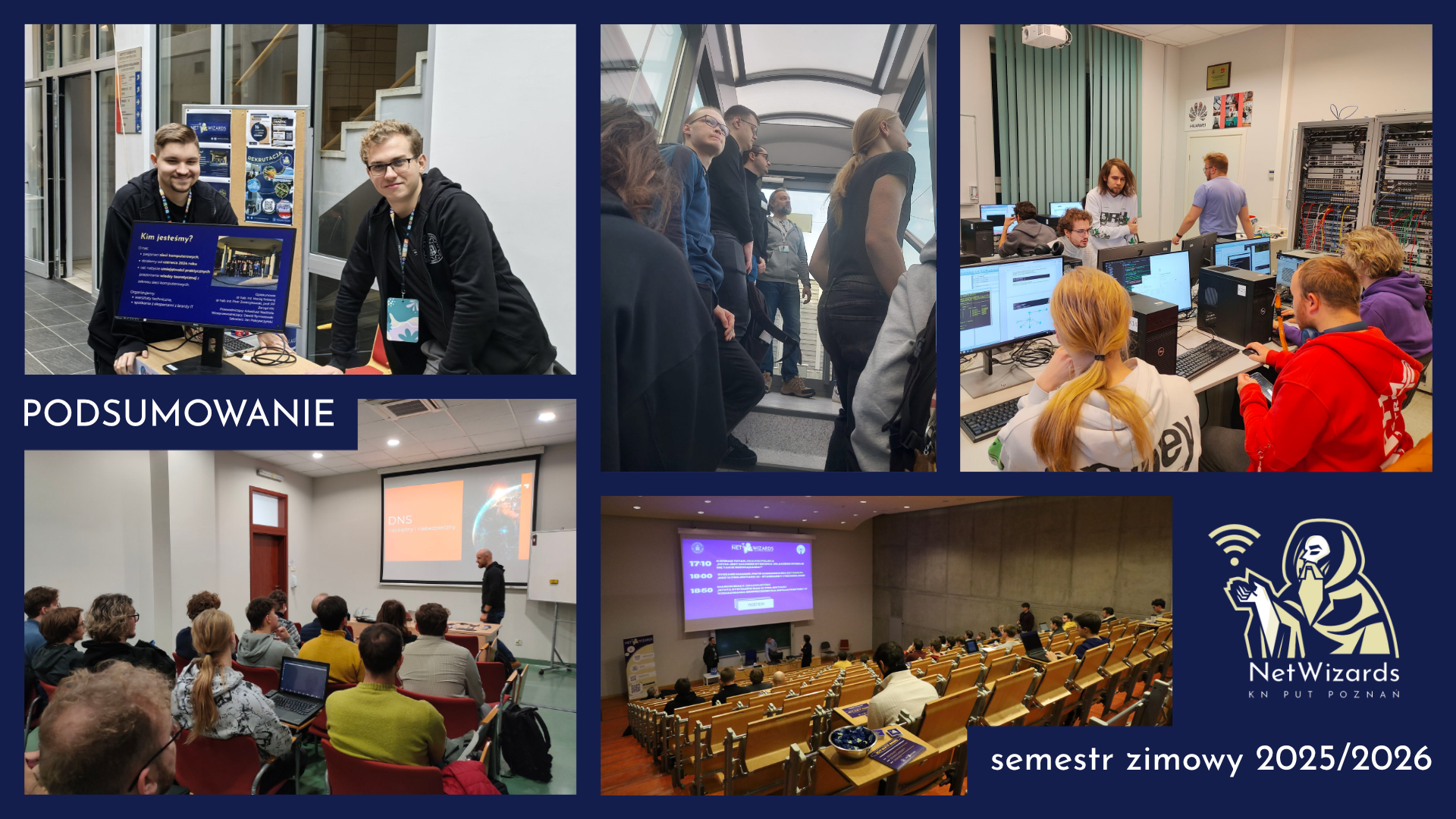 Odbyły się również warsztaty z SRLinux oraz prelekcja na temat niebezpieczeństw związanych z DNS. Wybraliśmy się do PCSS, gdzie zobaczyliśmy na żywo superkomputer, porozmawialiśmy o farmach AI i quantum computingu. Na horyzoncie pojawiły się dwa konkursy: Huawei ICT Competition 2025/2026 oraz Cisco Networking Academy Cup 2026 w których wspieramy naszych członków.